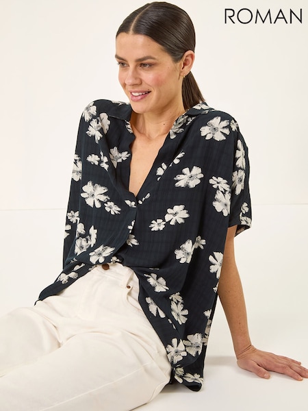 Roman Black Floral Print Pleat Tunic Top