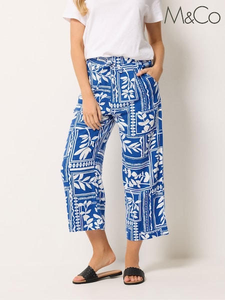 M&Co Blue Abstract Print Wide Leg Linen Blend Culottes
