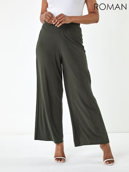 Roman Green Petite Elastic Waist Wide Leg Stretch Trousers