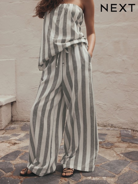 Blue/White Stripe Broderie Wide Leg Trousers With Linen