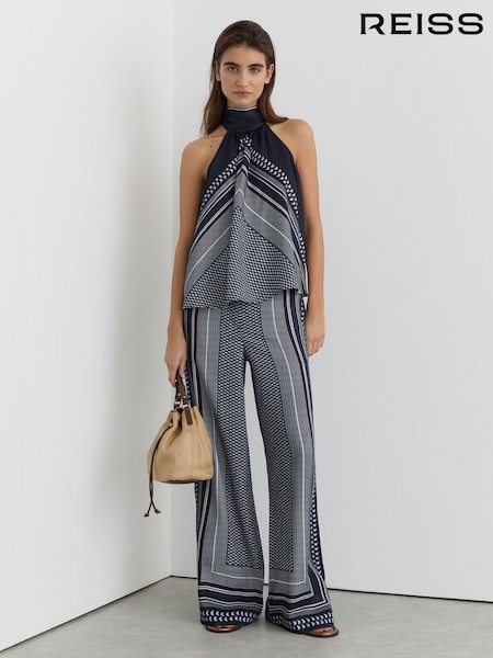 Reiss Navy Anna Scarf-Print Wide-Leg Trousers