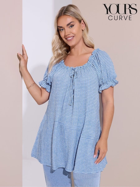 Blue Bright Gingham Summer Graphic Print Crew Neck T-Shirt