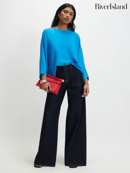 River Island Blue High Rise Relaxed Straight Turn Up Hem Jeans