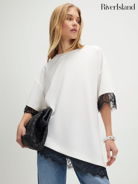 River Island Cream Short Sleeve Lace Trim Asymmetric T-Shirt