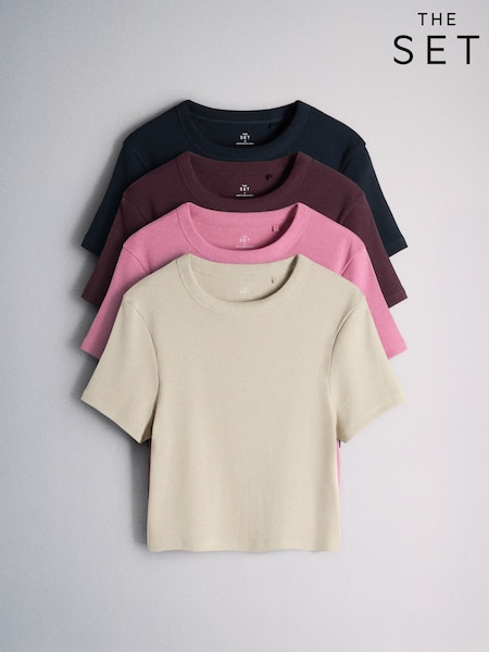 The Set 4 Pack Ribbed Cropped Fitted T-Shirts Dark Navy/Plum/Pink/Taupe