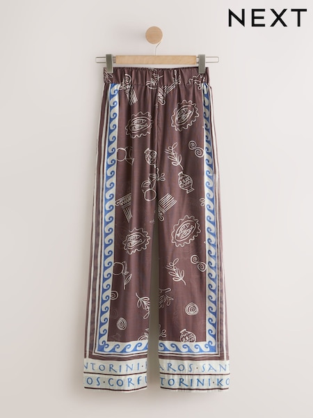 Brown/Blue Border Print Lightweight Pull-On Wide Leg Trousers
