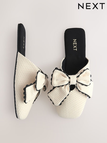 Neutral/Black Linen Blend Bow Mule Slippers