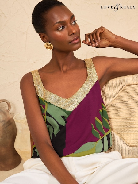 Love & Roses x RHS Berry Red Floral Satin Front Jersey Short Sleeve Top