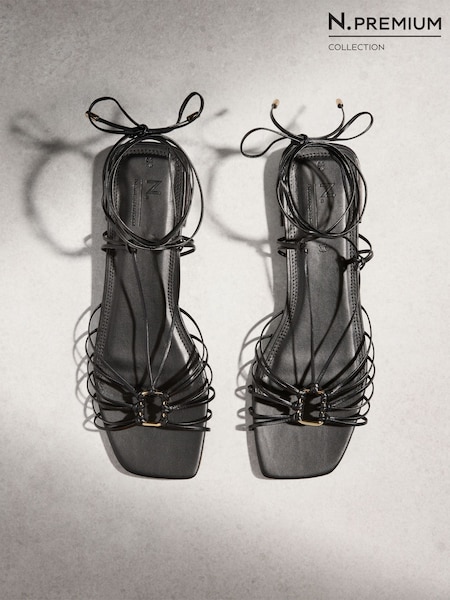 Black N. Premium Leather Square Toe Hardware Ankle Wrap Sandals