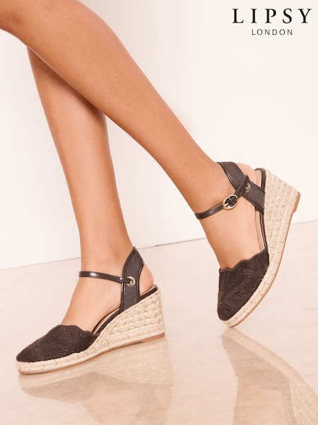 Lipsy Black Wide Fit Faux Suede Closed Toe Elastic Crossover Strap Mid Espadrille Wedges
