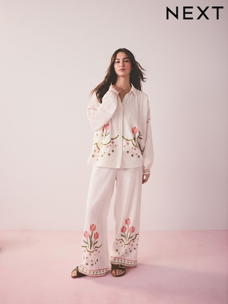 White Embroidered Tulip Textured Button Through Pyjamas