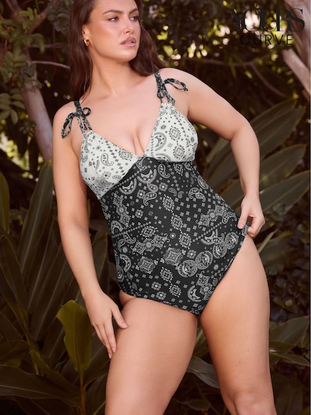 Yours Curve Black Black Ruched Mesh Tummy Control Swimsuit